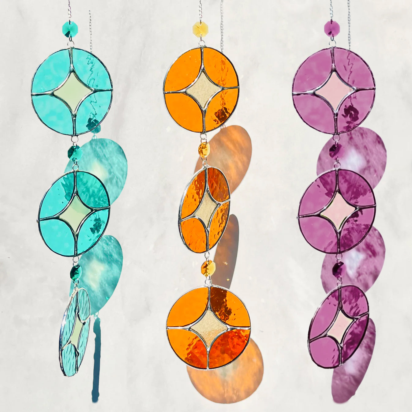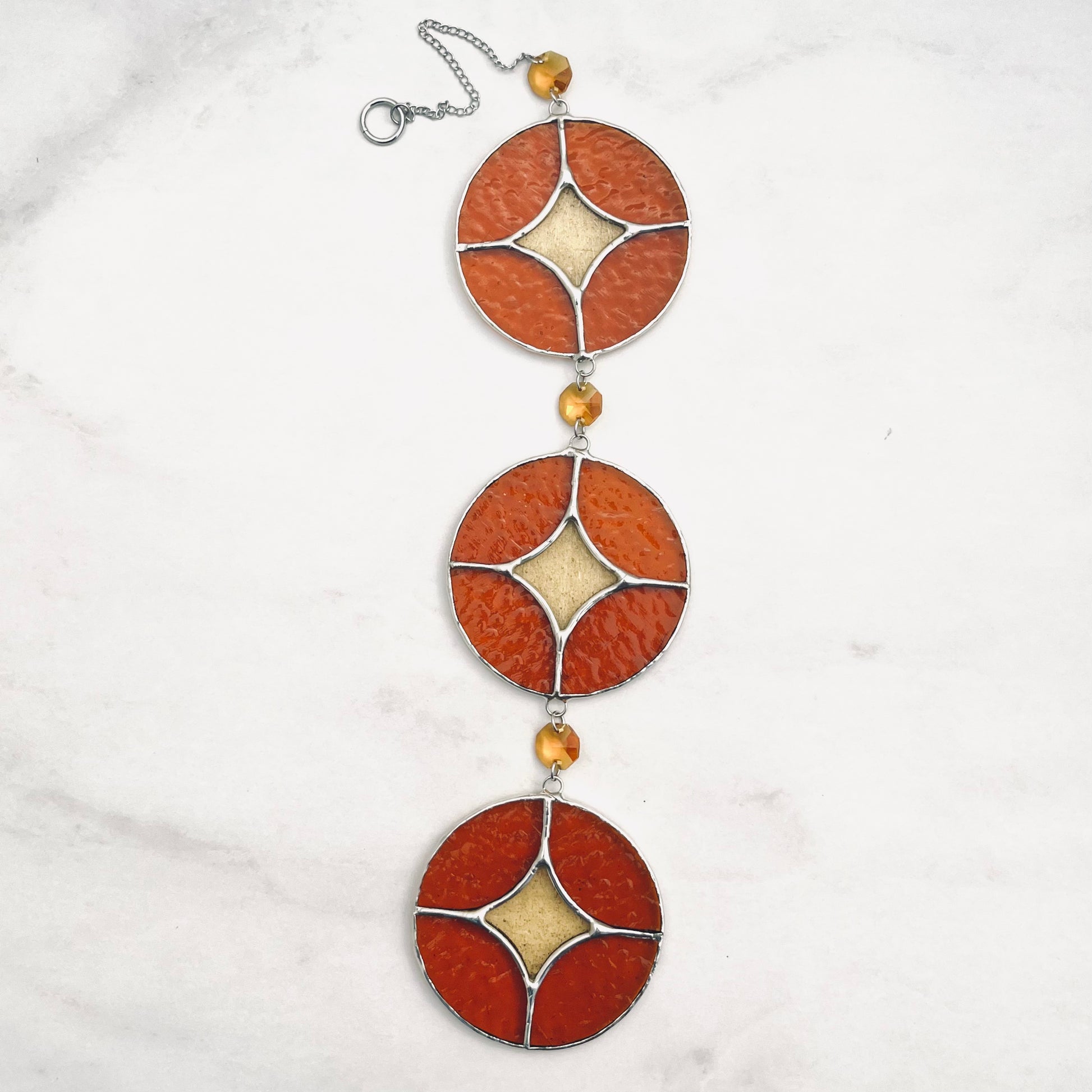 Size: Stained glass circles each: 3” wide by 3" high. Total height of dangler including chain: 17"